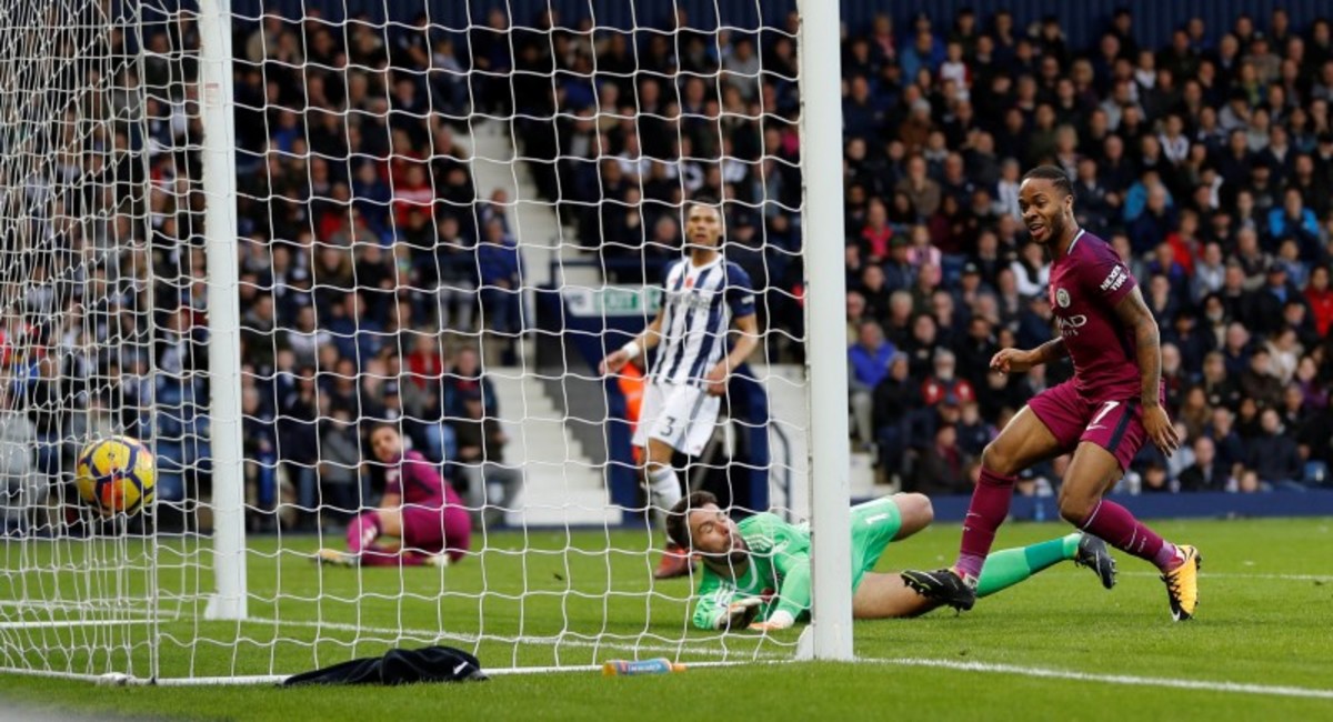 Soccer Football - Premier League - West Bromwich Albion vs Manchester City - The Hawthorns, West Bromwich, Britain - October 28, 2017 Manchester City's Raheem Sterling scores their third goal REUTERS/Darren Staples