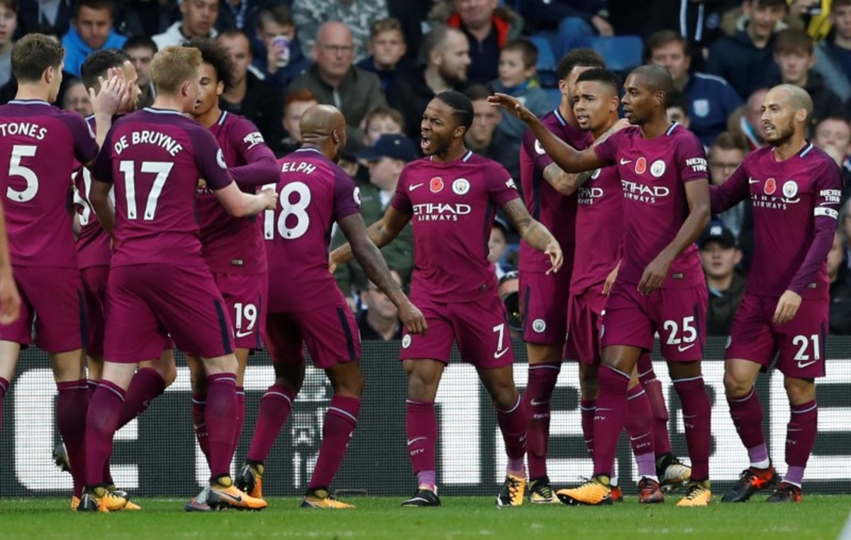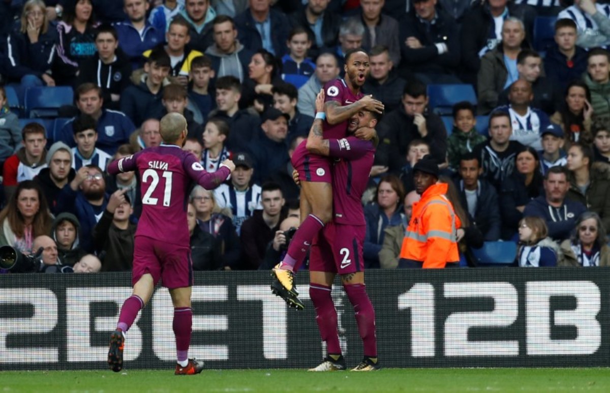 Soccer Football - Premier League - West Bromwich Albion vs Manchester City - The Hawthorns, West Bromwich, Britain - October 28, 2017 Manchester City's Fernandinho, Leroy Sane and Raheem Sterling celebrate after the match Action Images via Reuters/Andrew Boyers Soccer Football - Premier League - West Bromwich Albion vs Manchester City - The Hawthorns, West Bromwich, Britain - October 28, 2017 West Bromwich Albion's Grzegorz Krychowiak in action with Manchester City's Bernardo Silva and Kevin De Bruyne Action Images via Reuters/Andrew Boyers Soccer Football - Premier League - West Bromwich Albion vs Manchester City - The Hawthorns, West Bromwich, Britain - October 28, 2017 West Bromwich Albion's Matt Phillips scores their second goal Action Images via Reuters/Andrew Boyers Soccer Football - Premier League - West Bromwich Albion vs Manchester City - The Hawthorns, West Bromwich, Britain - October 28, 2017 Manchester City's Raheem Sterling celebrates scoring their third goal with Kyle Walker and David Silva Action Images via Reuters/Andrew Boyers Soccer Football - Premier League - West Bromwich Albion vs Manchester City - The Hawthorns, West Bromwich, Britain - October 28, 2017 Manchester City's John Stones reacts after West Bromwich Albion's Jay Rodriguez scores their first goal Action Images via Reuters/Andrew Boyers Soccer Football - Premier League - West Bromwich Albion vs Manchester City - The Hawthorns, West Bromwich, Britain - October 28, 2017 West Bromwich Albion's Jonny Evans in action with Manchester City's David Silva Action Images via Reuters/Andrew Boyers Soccer Football - Premier League - West Bromwich Albion vs Manchester City - The Hawthorns, West Bromwich, Britain - October 28, 2017 Manchester City manager Pep Guardiola Action Images via Reuters/Andrew Boyers Soccer Football - Premier League - West Bromwich Albion vs Manchester City - The Hawthorns, West Bromwich, Britain - October 28, 2017 West Bromwich Albion manager Tony Pulis Action Images via Reuters/Andrew Boyers