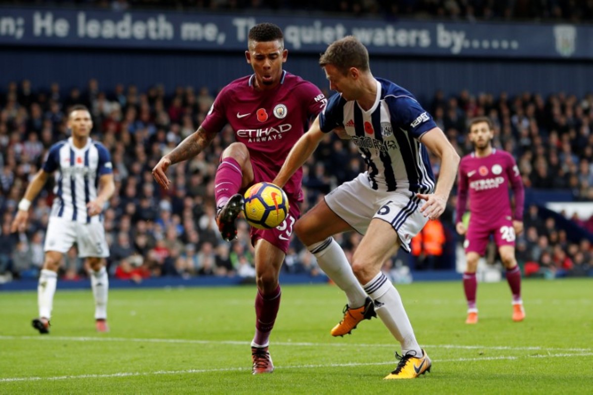 Soccer Football - Premier League - West Bromwich Albion vs Manchester City - The Hawthorns, West Bromwich, Britain - October 28, 2017 Manchester City's Gabriel Jesus in action with West Bromwich Albion's Jonny Evans REUTERS/Darren Staples