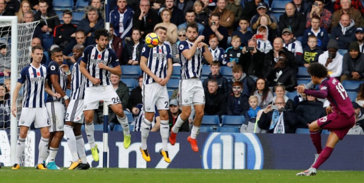 Soccer Football - Premier League - West Bromwich Albion vs Manchester City - The Hawthorns, West Bromwich, Britain - October 28, 2017 Manchester City's Leroy Sane shoots at goal from a free-kick REUTERS/Darren Staples