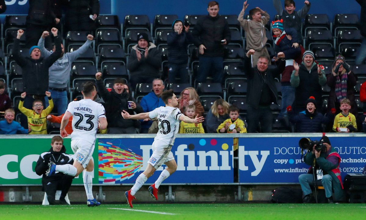 FILE PHOTO: Soccer Football - FA Cup Fifth Round - Swansea City v Brentford, Liberty Stadium, Swansea, Britain - February 17, 2019 Swansea City's Daniel James celebrates scoring their second goal Action Images via Reuters/Andrew Couldridge