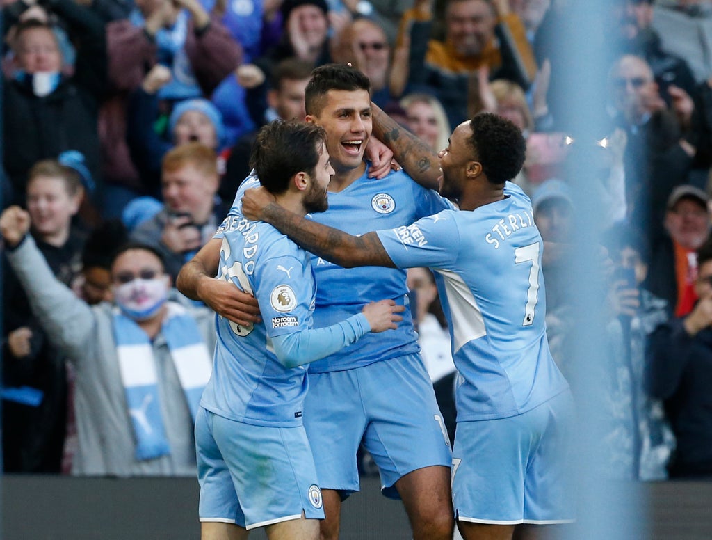 Rodri made it 2-0 with a thundering long-distance strike that whistled past Everton keeper Jordan Pickford.