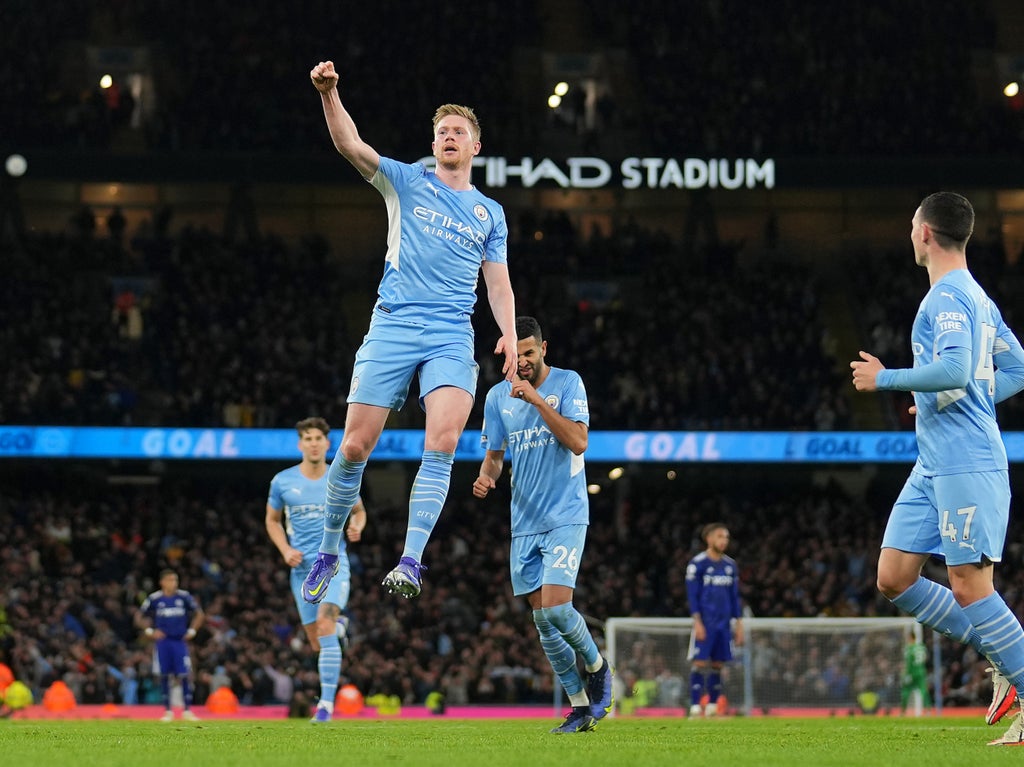 A scintillating showing from Phil Foden saw the England midfielder open the scoring and provide the assist for substitute Nathan Ake’s goal – the seventh of the night – but it was De Bruyne who starred with two powerful finishes.