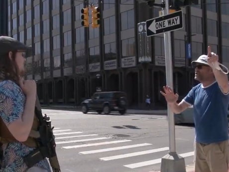 "No, god, no," replies the boogaloo member. The confrontation ends after the man asks "Why don’t you just take your steroid-shrunken nuts out of Ann Arbor, man?"