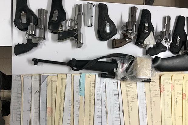 The officers, led by Pol Col Chatupong Jaiklaew, chief of Mai Riang police station, seized six weapons, 15 rounds of ammunition, 30 title deeds, 14 motorcycles and a car from the house.