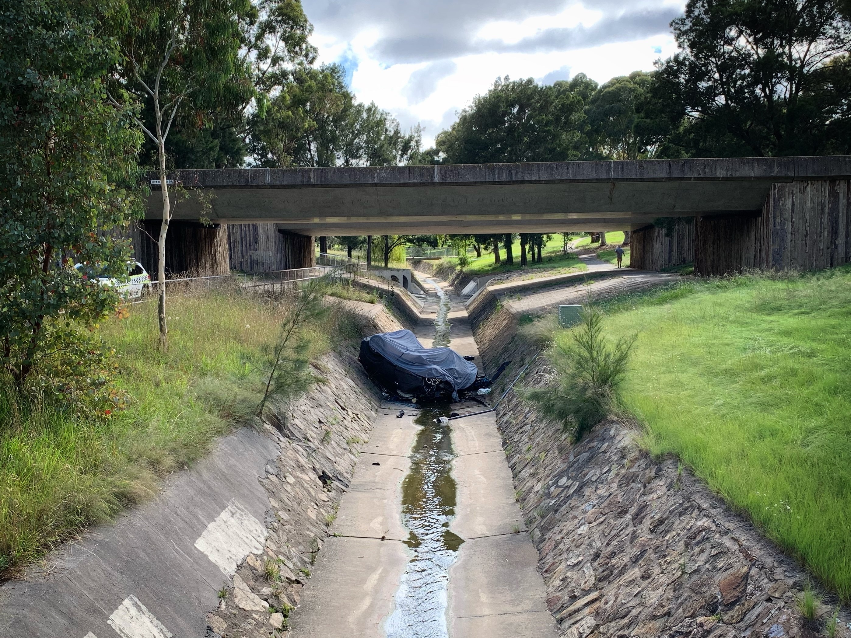 Emergency services were called to Drakeford Drive in Greenway about 8pm on Wednesday and found the car overturned in the drain.