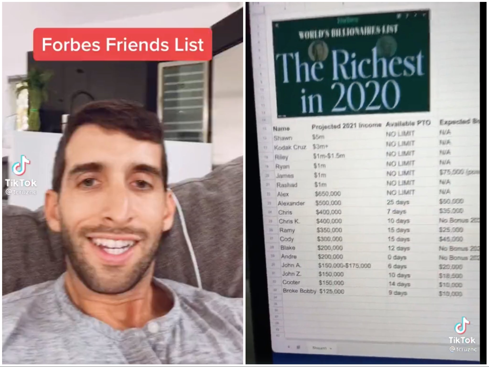 Tom Cruz (@tcruznc) shared his very own “Forbes Friend List” on TikTok, which ranked his pals by income: from “Shawn, my top earning friend who makes over $5 million, to who we call ‘Broke Bob’ who makes $125,000.”