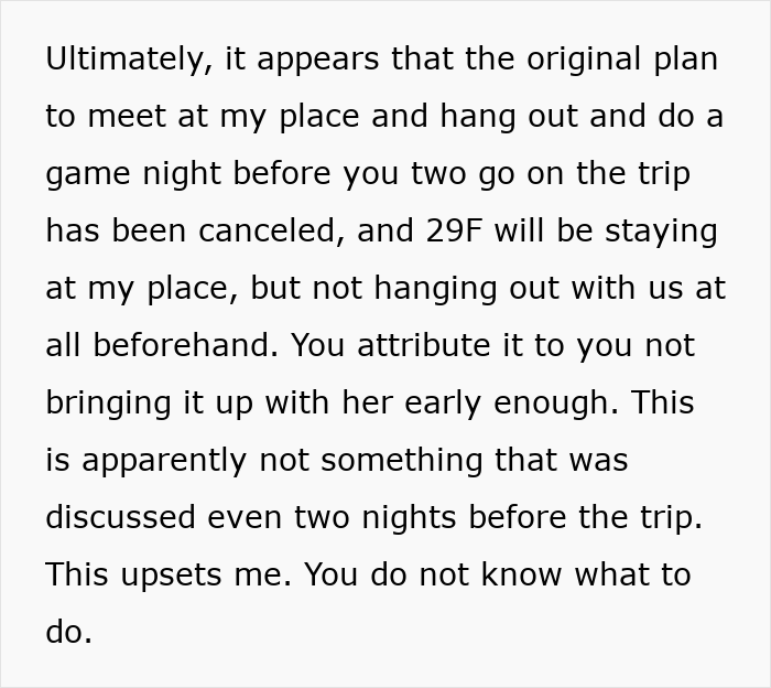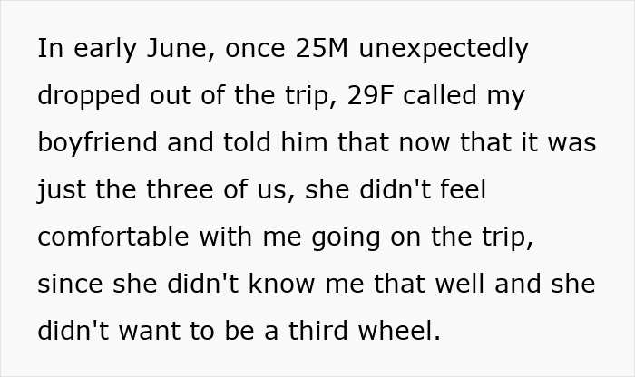 But when one friend backed out, the BF disinvited his own GF so he could go on vacation with his female best friend