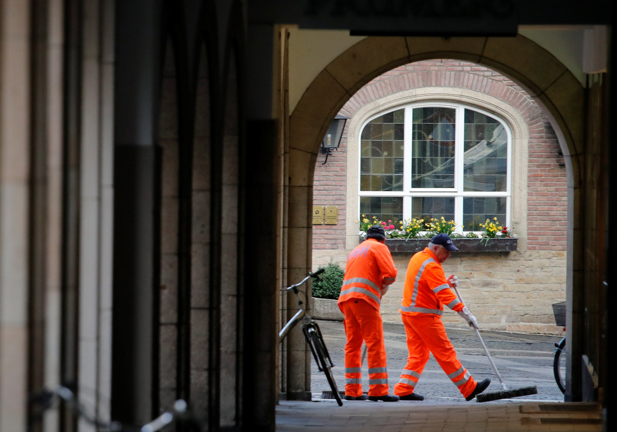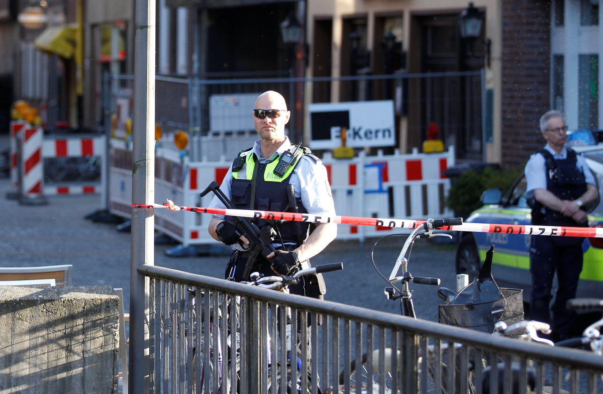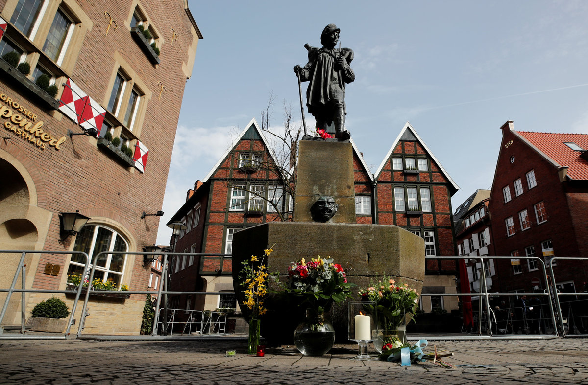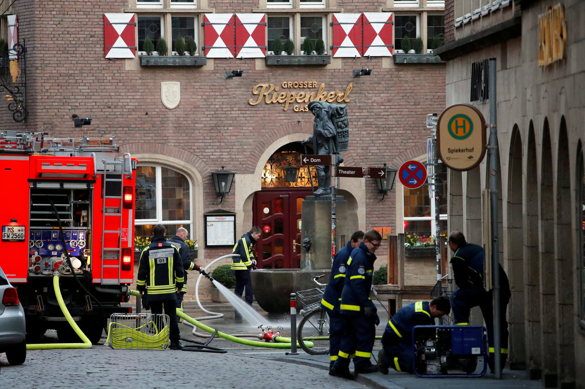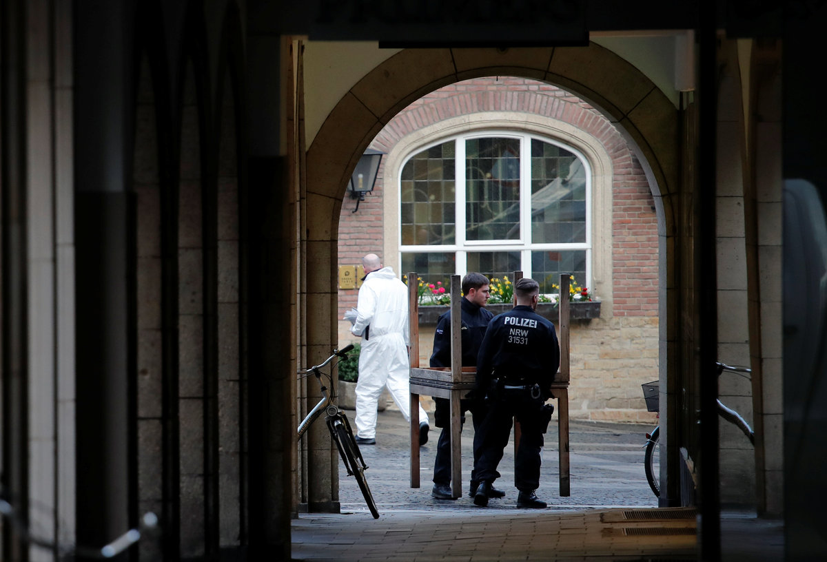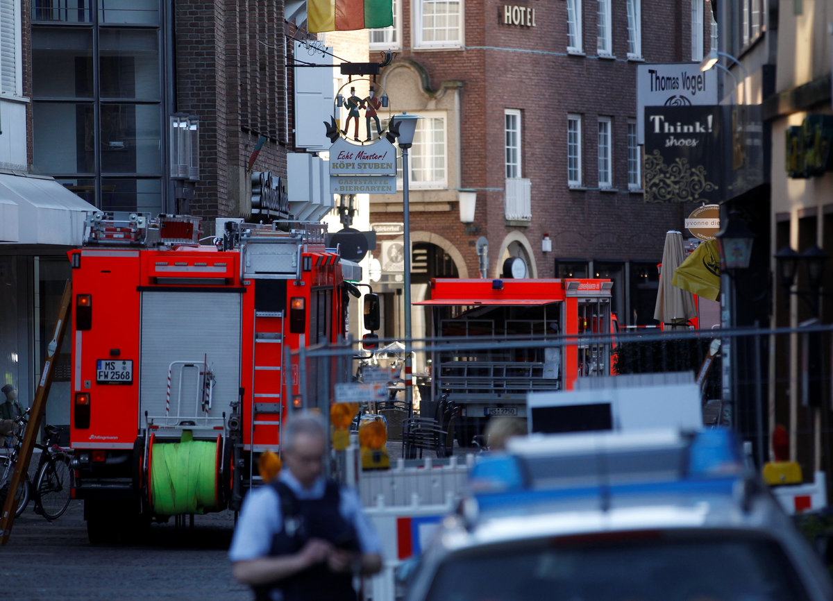 Firefighters of the city of Muenster clean the area in front of the traditional Grosser Kiepenkerl guesthouse where a man drove a van into a group of people sitting outside its restaurant in the old city centre of Muenster, Germany, April 8, 2018. REUTERS/Wolfgang Rattay TPX IMAGES OF THE DAYStreet cleaners sweep in front of the traditional guesthouse "Grosser Kiepenkerl", where a man drove a van into a group of people sitting outside the popular restaurant in the old city centre of Muenster, Germany, April 8, 2018. REUTERS/Wolfgang RattayA police investigator makes notes in front of the traditional guesthouse "Grosser Kiepenkerl", where a man drove a van into a group of people sitting outside the popular restaurant in the old city centre of Muenster, Germany, April 8, 2018. REUTERS/Wolfgang RattayPolice carry restaurant tables in front of the traditional guesthouse "Grosser Kiepenkerl", where a man drove a van into a group of people sitting outside the popular restaurant in the old city centre of Muenster, Germany, April 8, 2018. REUTERS/Wolfgang RattayPolice block a street near a place where a man drove a van into a group of people sitting outside a popular restaurant in the old city centre of Muenster, Germany, April 7 2018. Muenster Germany, April 7, 2018. REUTERS/StaffPolice stands guard in a street near a place where a man drove a van into a group of people sitting outside a popular restaurant in the old city centre of Muenster, Germany, April 7, 2018. REUTERS/Leon KuegelerPolice vehicles and fire engines in a street near a place where a man drove a van into a group of people sitting outside a popular restaurant in the old city centre of Muenster, Germany, April 7, 2018. REUTERS/Leon KuegelerPolice block a street near a place where a man drove a van into a group of people sitting outside a popular restaurant in the old city centre of Muenster, Germany, April 7 2018. REUTERS/Elke AhlswedePeople walk near a place where a man drove a van into a group of people sitting outside a popular restaurant in the old city centre of Muenster, Germany, April 7, 2018. REUTERS/NonstopNews Special police gather in a street near a place where a man drove a van into a group of people sitting outside a popular restaurant in the old city centre of Muenster, Germany, April 7, 2018. REUTERS/Leon KuegelerPolice block a street near a place where a man drove a van into a group of people sitting outside a popular restaurant in the old city centre of Muenster, Germany, April 7, 2018. REUTERS/Leon Kuegeler
