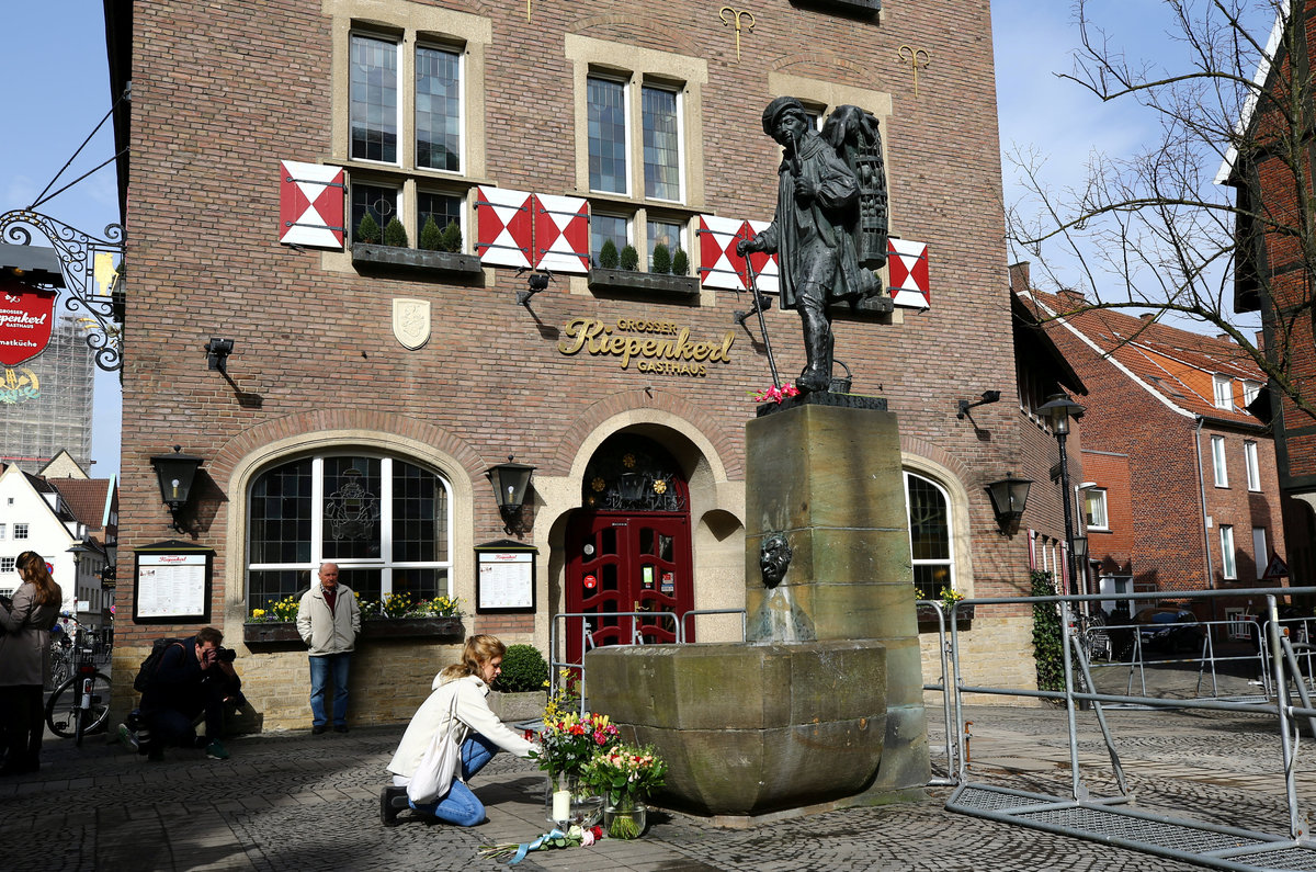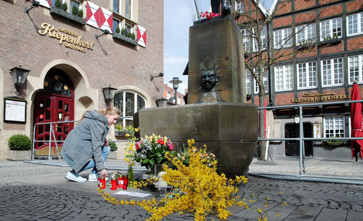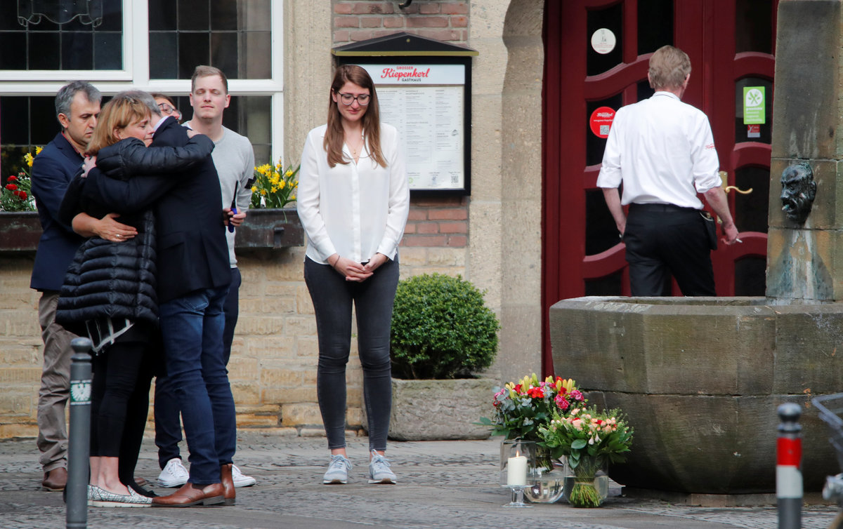 People mourn in front of the traditional guesthouse, Grosser Kiepenkerl, where a man drove a van into a group of people sitting outside the popular restaurant in the old city centre of Muenster, Germany, April 8, 2018. REUTERS/Wolfgang Rattay