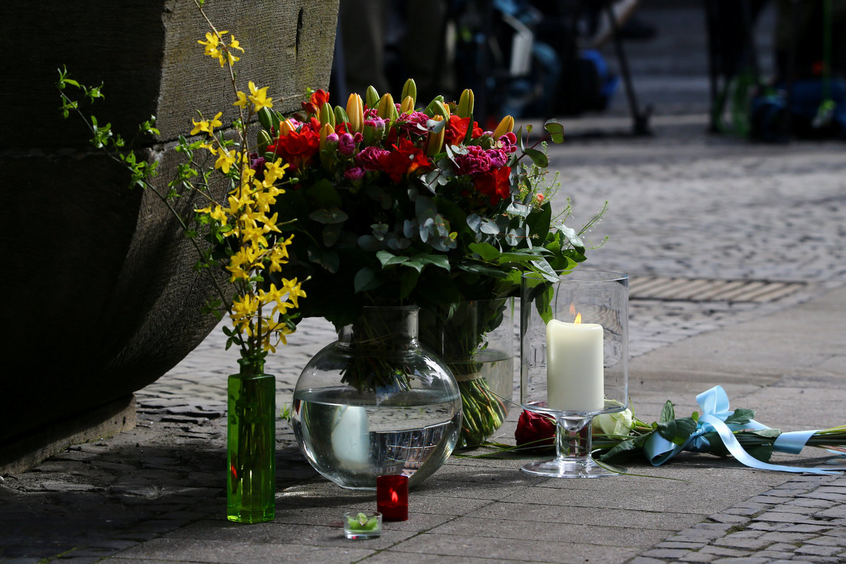 Flowers are seen on the site where on April 7 a man drove a van into a group of people sitting outside a popular restaurant in the old city centre of Muenster, Germany, April 8, 2018. REUTERS/Wolfgang Rattay
