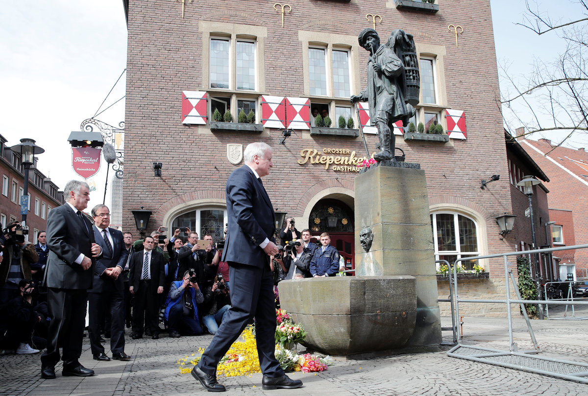 German Minister of Interior Horst Seehofer arrives at the site where on April 7 a man drove a van into a group of people sitting outside a popular restaurant in the old city centre of Muenster, Germany April 8, 2018. REUTERS/Wolfgang Rattay