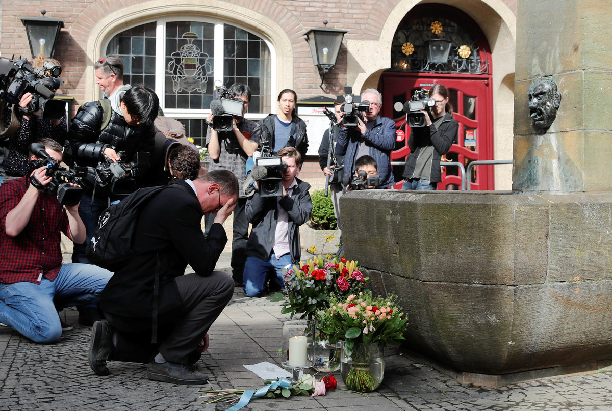A man is surrounded by the media as he mourns on the site where on April 7 a man drove a van into a group of people sitting outside a popular restaurant in the old city centre of Muenster, Germany April 8, 2018. REUTERS/Wolfgang Rattay