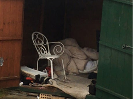 Inside the shed was a single chair, a soiled duvet and a metered television. There was no heating.