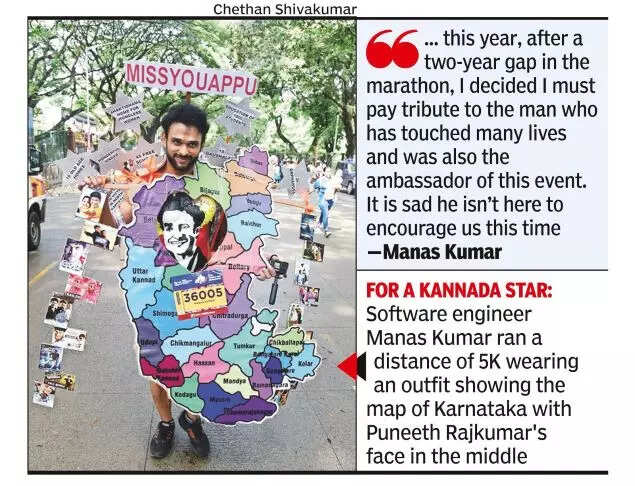 BENGALURU: The map of Karnakata with a smiling Puneeth Rajkumar’s picture right in the middle was the costume worn by one marathon runner at the Tata Consultancy Services World 10K Bengaluru marathon on Sunday.