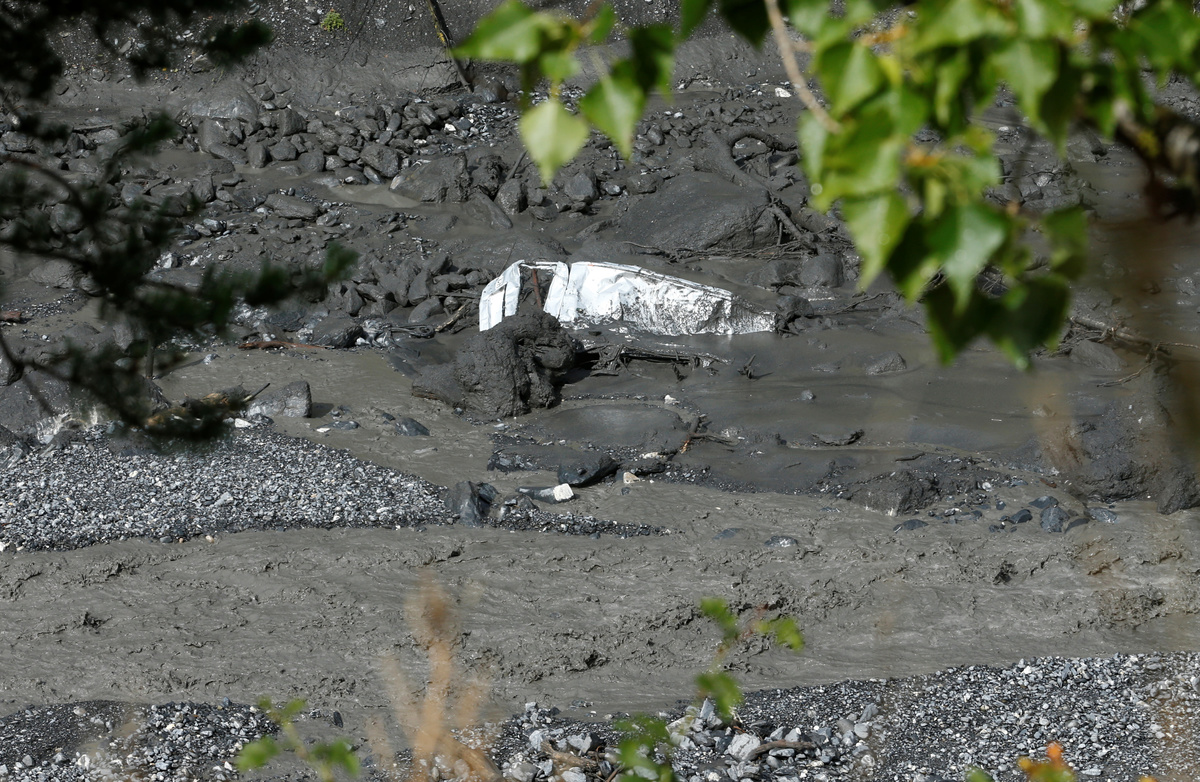 The wreckage of a car is pictured in the Losentze river after a flash flood in Chamoson, Switzerland, August 12, 2019. REUTERS/Denis Balibouse