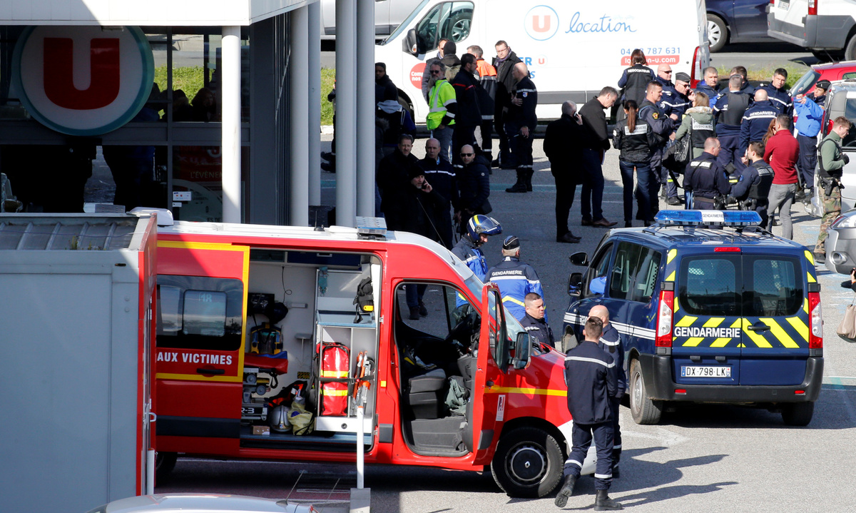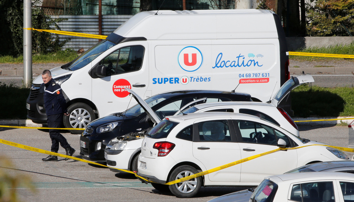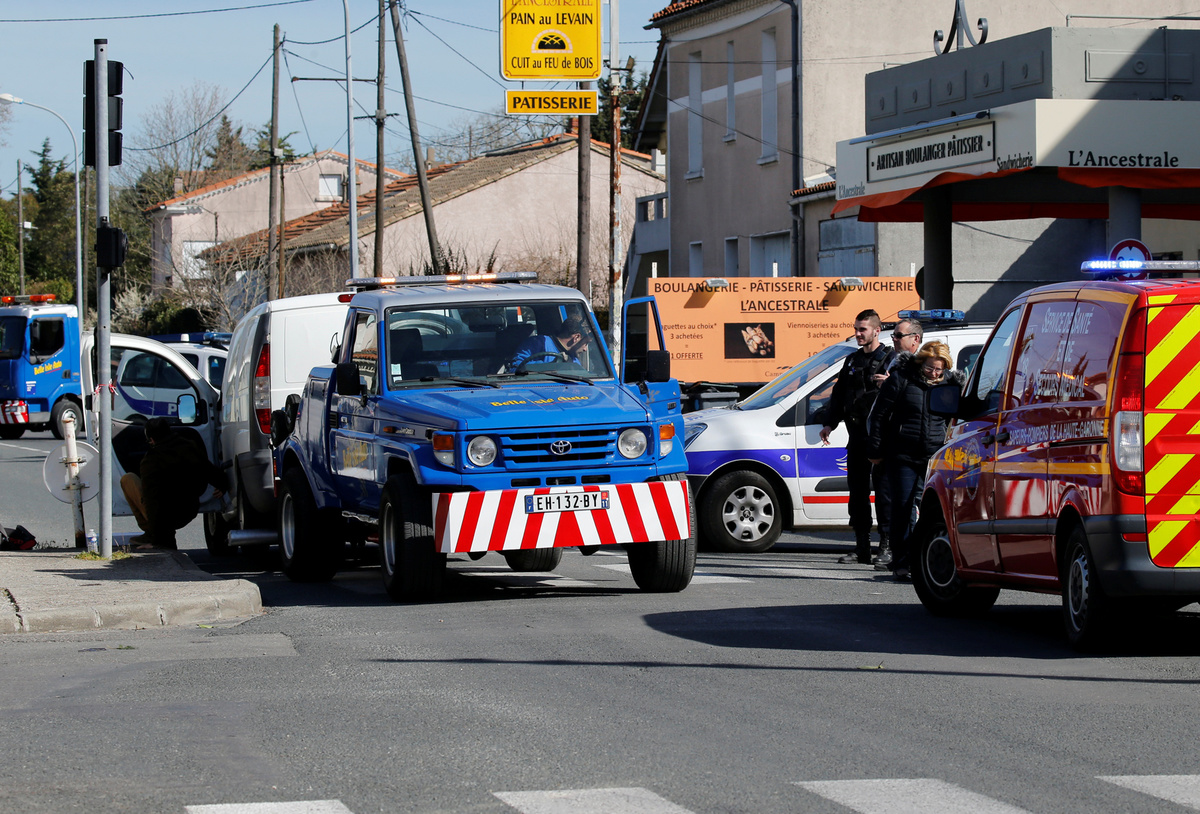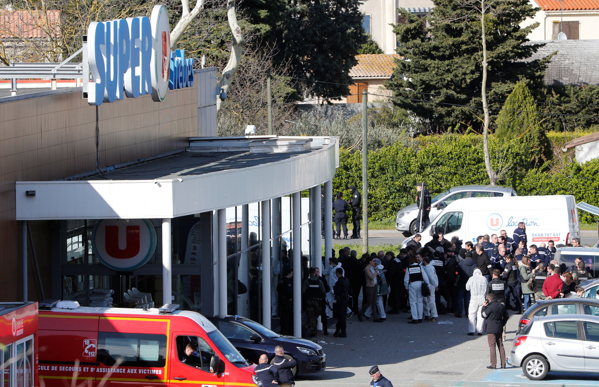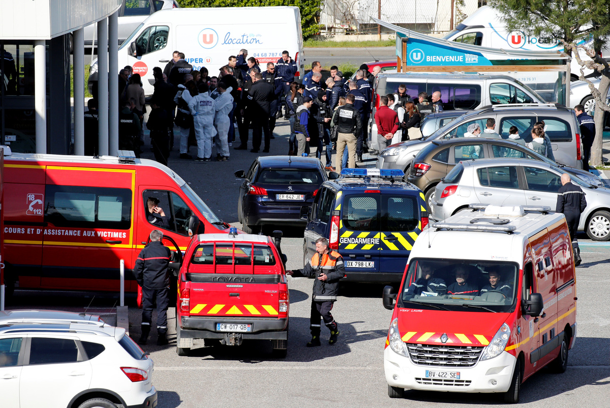 TREBES, France (Reuters) - A gunman killed three people in southwestern France on Friday as he held up a car, fired on police and seized hostages in a supermarket, screaming "Allahu Akbar" before security forces stormed the building and killed him, authorities said.