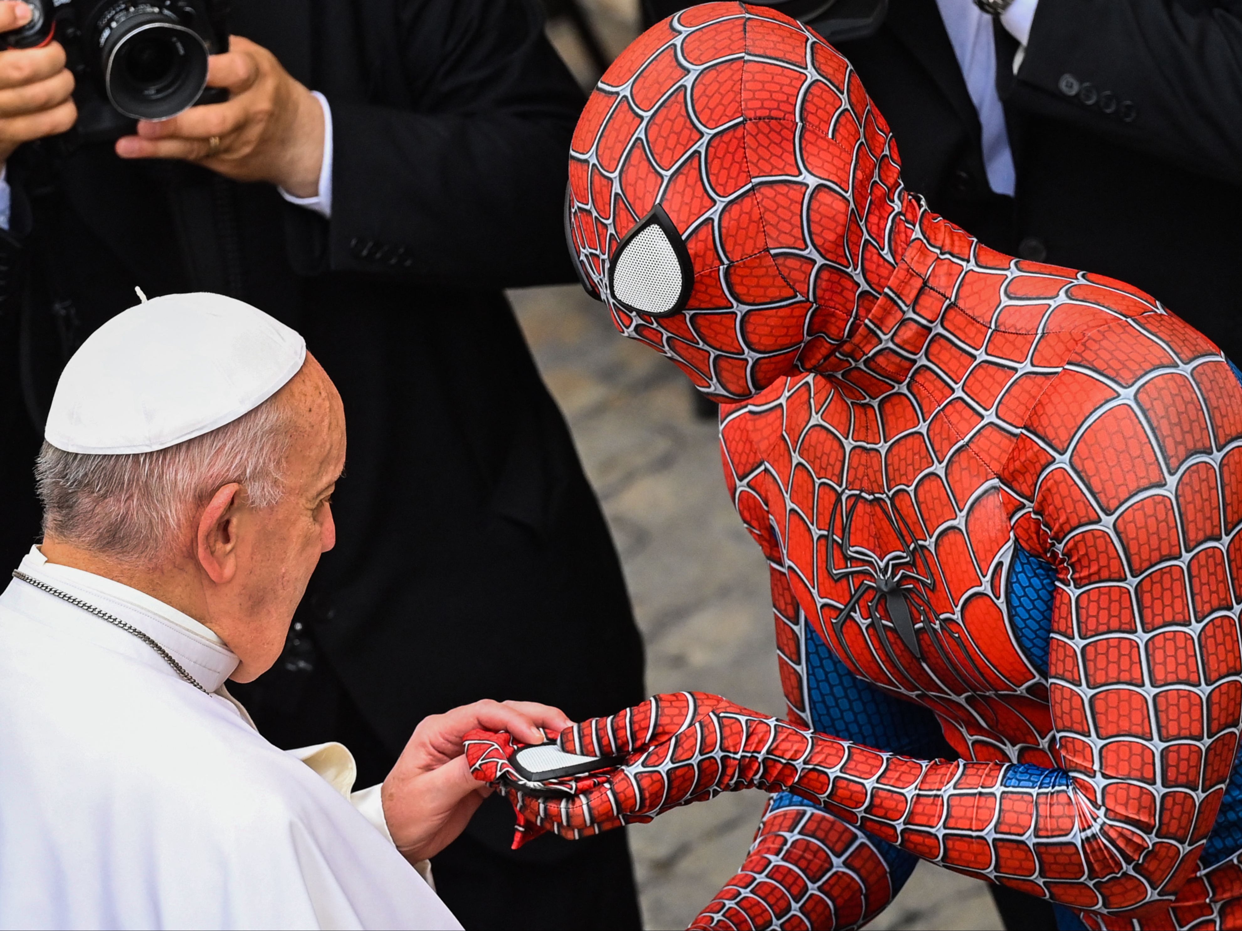 (Picture: AFP via Getty Images)Spider-Man swung by to meet Pope Francis at the Vatican on Wednesday.