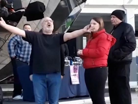 Marching up to the DJ in Millennium Square, Bristol, he can be heard shouting: “It is seven o’clock in the morning, I was asleep in the f***ing hotel. Turn the f***ing noise down.”