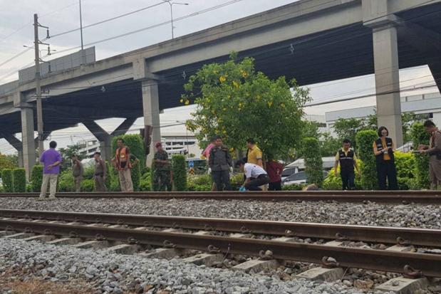 A tattooed man of unknown nationality was killed by a Bangkok-bound train in Bangkok's Don Muang district on Wednesday morning, leaving parts of his head and one foot scattered on rail tracks,