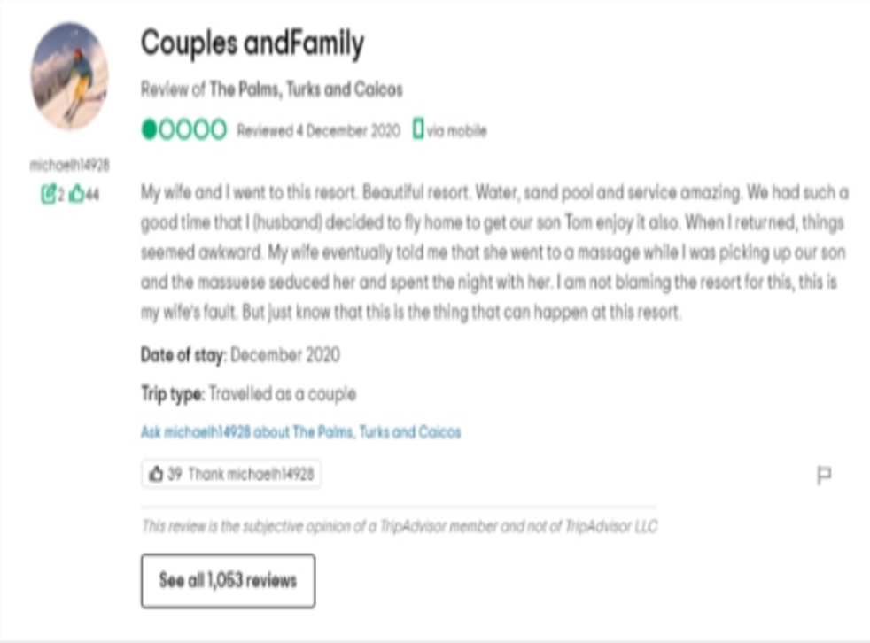 An aggrieved husband left a one-star TripAdvisor review of a hotel resort in which he claimed his wife had been “seduced” by an in-house masseuse.
