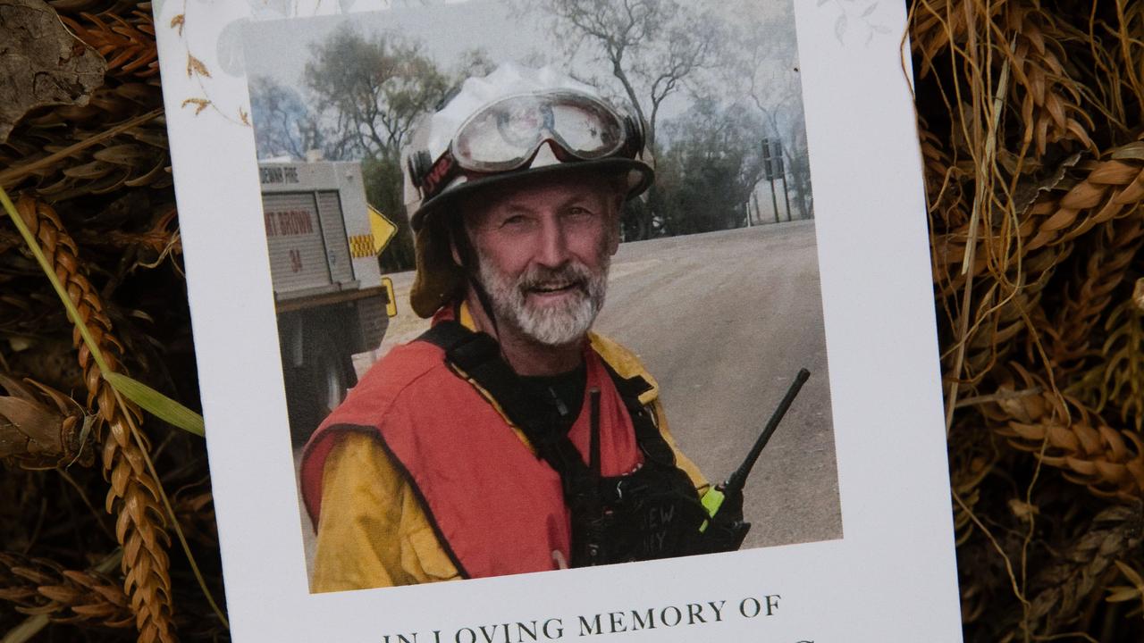 At Wednesday's outdoor service, his coffin was parked on the grass under the trees, draped with a Country Fire Service flag, with two of his white firefighting helmets on top.