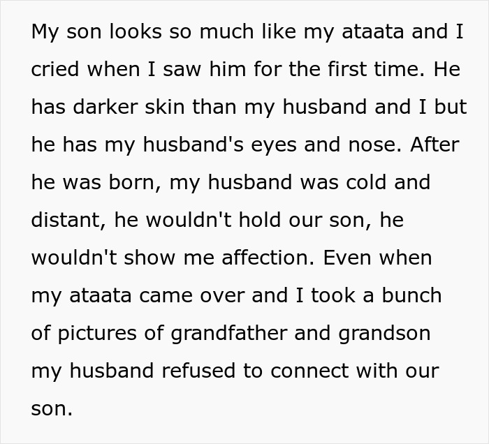 The author says that she mainly took her appearance from her biological mom, but her son inherited many of the traits of his grandpa. However, the baby’s eyes and nose were exactly like his father’s. And so, when the OP’s husband saw the kid, he reacted very coldly, and even refused to take him in his arms.