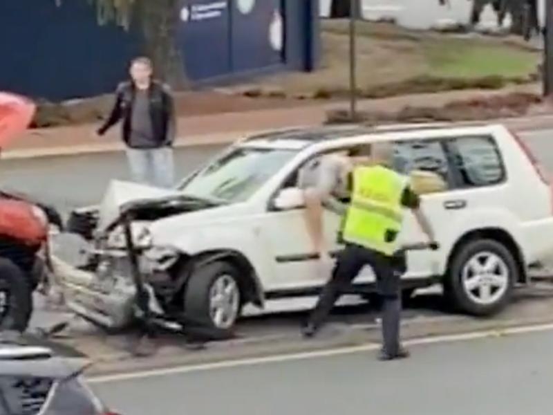 He was allegedly given numerous directions to remain in one of the damaged vehicles, but he continued to attempt to get out by kicking the door into the officer.