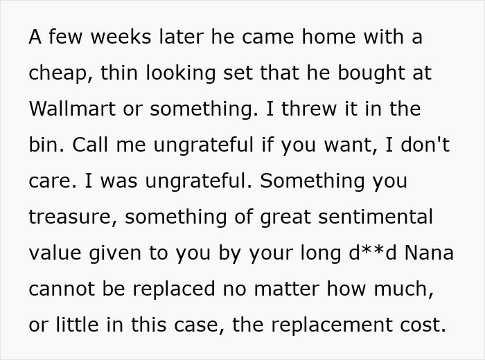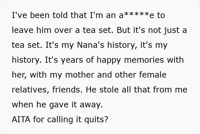 We would love to hear your thoughts on this situation in the comments below, pandas. Do you think this woman made the right choice by ending her marriage over this tea set drama? Feel free to weigh in. Then, you can find another Bored Panda article discussing similar marital issues right here.