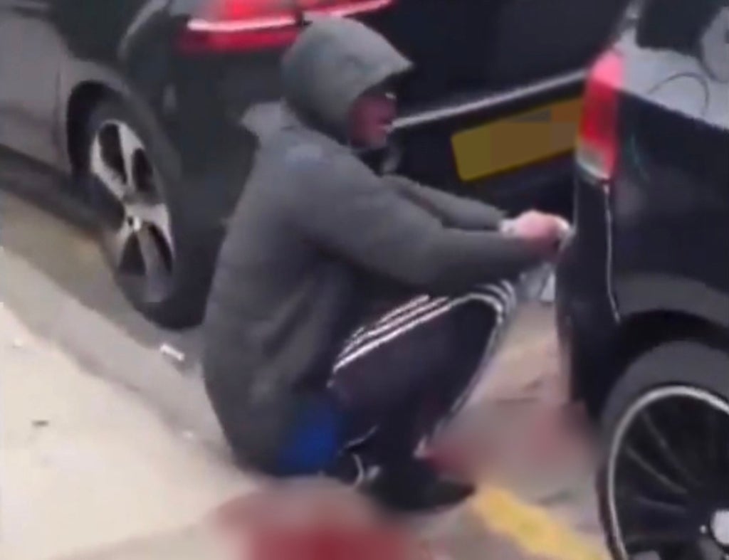 In footage posted on social media, the man is sitting on the kerb of a pavement holding a tea towel to his arm while surrounded by splatters of his blood.