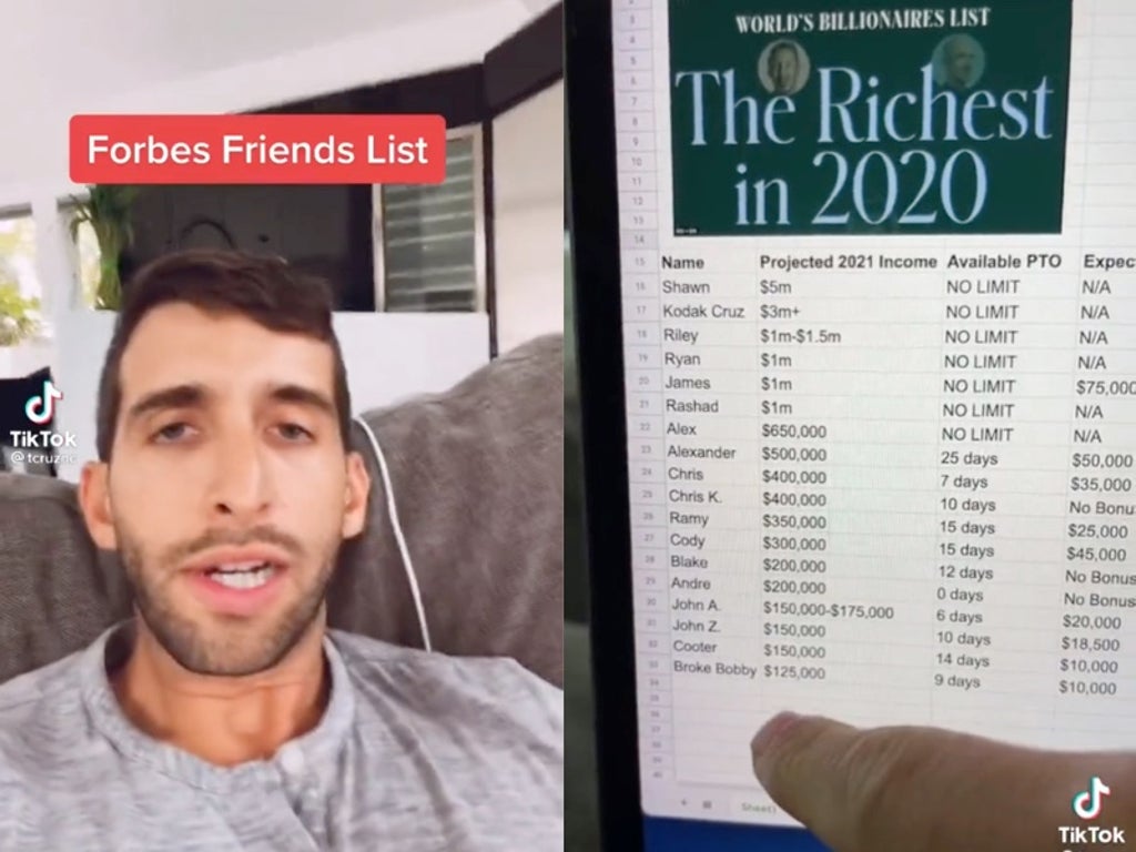 Cruz then offered a close-up view of the spreadsheet, where his “top-earning friend” Shawn is listed to have a projected income of $5m in 2021, before pointing to the last name on the list, who he revealed his friends call “broke Bobby” because he makes $125,000. According to the spreadsheet, six individuals make $1m or more, while the rest make at least six figures in income annually.