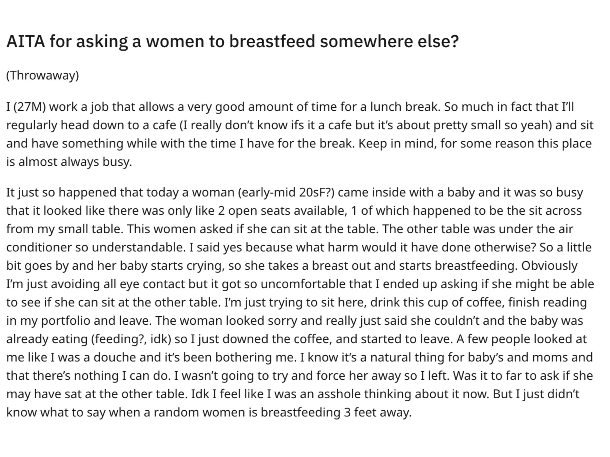 He went on: “The woman looked sorry and really just said she couldn’t and the baby was already eating (feeding?, [I don’t know]) so I just downed the coffee, and started to leave.
