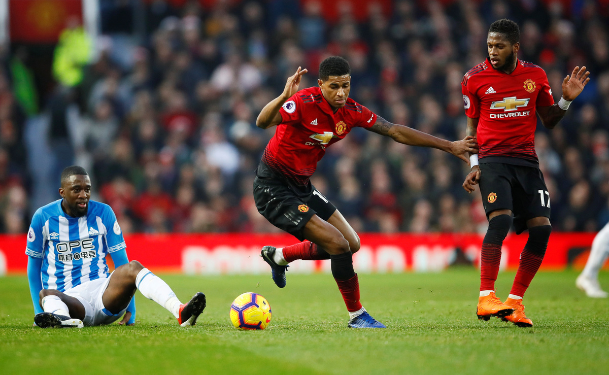 Soccer Football - Premier League - Manchester United v Huddersfield Town - Old Trafford, Manchester, Britain - December 26, 2018 Manchester United's Marcus Rashford and Fred in action with Huddersfield Town's Isaac Mbenza.Action Images via Reuters/Jason Cairnduff