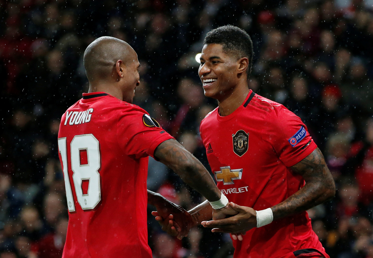 Soccer Football - Europa League - Group L - Manchester United v Partizan Belgrade - Old Trafford, Manchester, Britain - November 7, 2019 Manchester United's Marcus Rashford celebrates scoring their third goal with teammate Ashley Young REUTERS/Andrew Yates