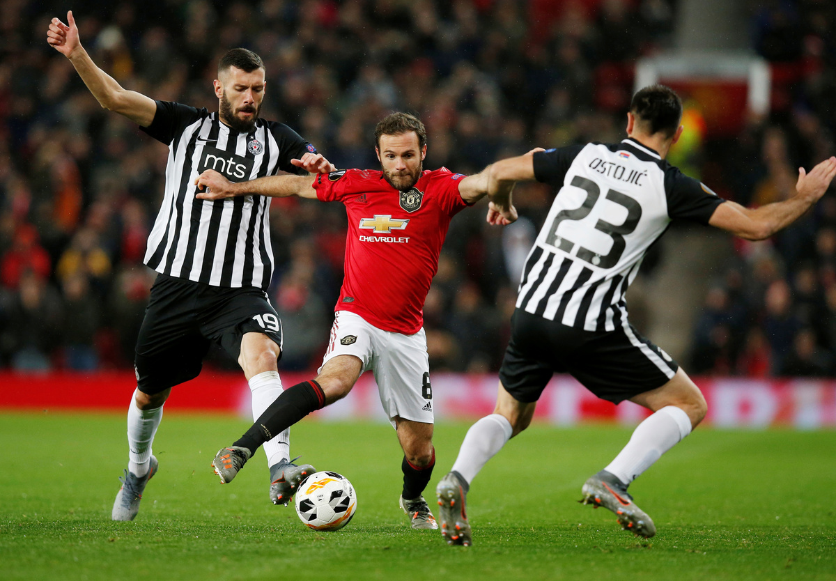 Soccer Football - Europa League - Group L - Manchester United v Partizan Belgrade - Old Trafford, Manchester, Britain - November 7, 2019 Manchester United's Juan Mata in action with Partizan Belgrade's Aleksandar Scekic and Bojan Ostojic REUTERS/Andrew YatesSoccer Football - Europa League - Group L - Manchester United v Partizan Belgrade - Old Trafford, Manchester, Britain - November 7, 2019 Manchester United's Marcus Rashford in action with Partizan Belgrade's Vladimir Stojkovic REUTERS/Andrew YatesSoccer Football - Europa League - Group L - Manchester United v Partizan Belgrade - Old Trafford, Manchester, Britain - November 7, 2019 Manchester United's Anthony Martial in action with Partizan Belgrade's Zoran Tosic REUTERS/Andrew YatesSoccer Football - Europa League - Group L - Manchester United v Partizan Belgrade - Old Trafford, Manchester, Britain - November 7, 2019 Manchester United's Marcus Rashford in action with Partizan Belgrade's Vladimir Stojkovic REUTERS/Andrew YatesSoccer Football - Europa League - Group L - Manchester United v Partizan Belgrade - Old Trafford, Manchester, Britain - November 7, 2019 Partizan Belgrade coach Savo Milosevic reacts REUTERS/Andrew Yates