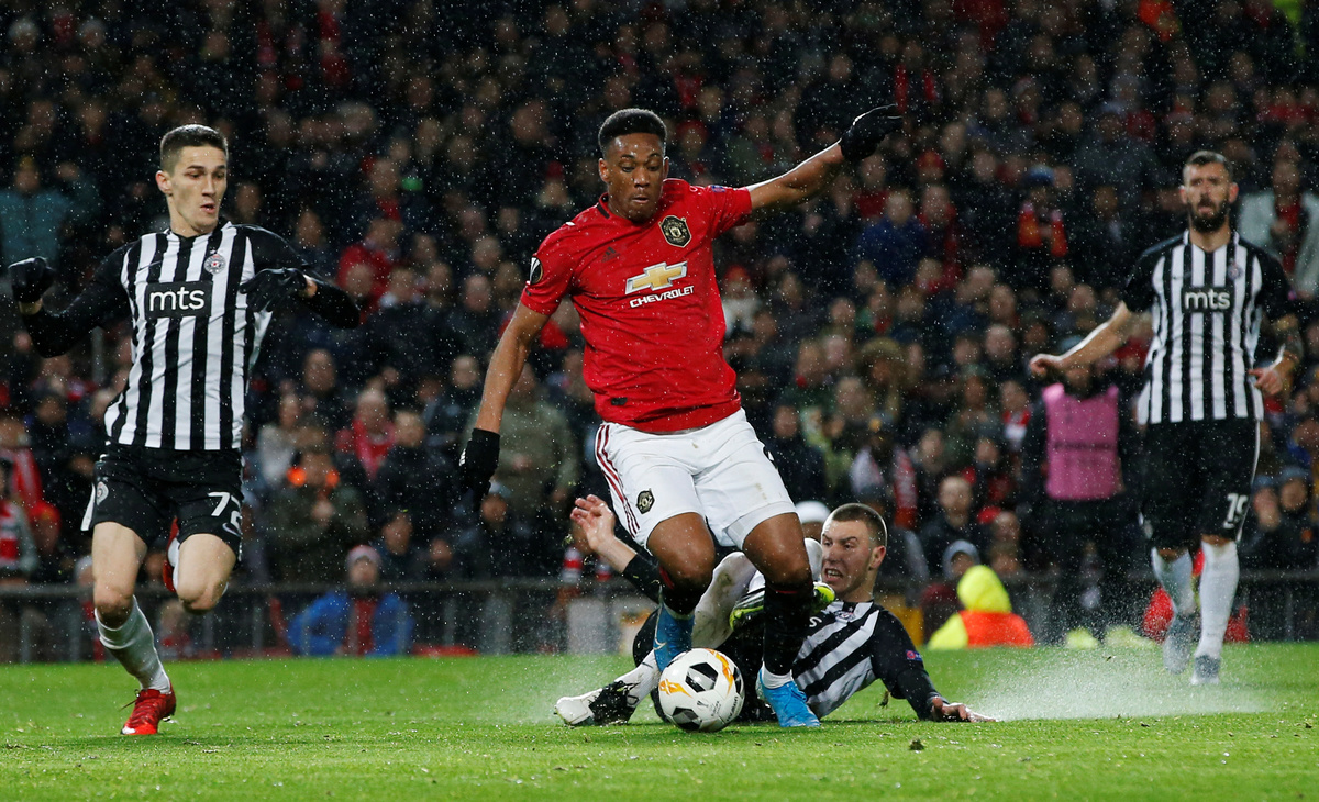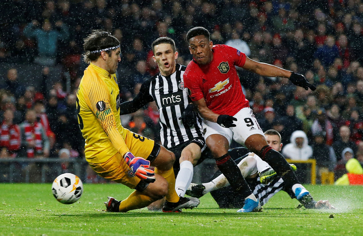 Soccer Football - Europa League - Group L - Manchester United v Partizan Belgrade - Old Trafford, Manchester, Britain - November 7, 2019 Manchester United's Anthony Martial scores their second goal REUTERS/Andrew Yates