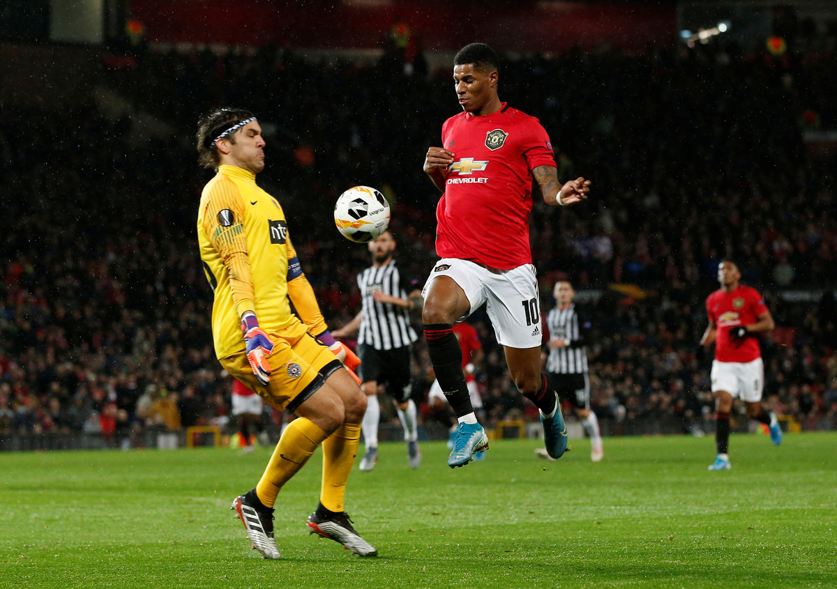 Soccer Football - Europa League - Group L - Manchester United v Partizan Belgrade - Old Trafford, Manchester, Britain - November 7, 2019 Manchester United's Marcus Rashford in action with Partizan Belgrade's Sasa Zdjelar REUTERS/Andrew Yates
