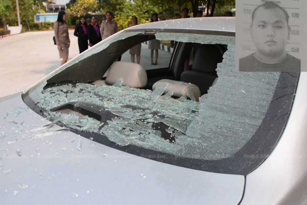 Jetkhati Wonglert, 23, allegedly used a lump of concrete while riding a big bike to smash the rear window of a car parked at a government office. The car belonged to a teacher who was at meeting there.