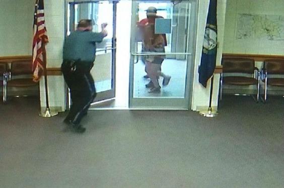 Oficers said that Jonathan Morrow had entered the Johnson County Sheriff's Department last week to file an emergency protective order against his wife. Police said Mr Morrow was distraught after his wife ran off to Ohio with a man she had met on the internet.
