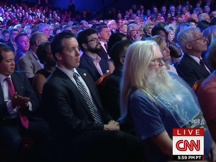 Audience members were filmed during the debate, which was broadcast live from Las Vegas by CNN on Tuesday night, and one man with long white hair and a long white beard wearing a T-shirt stood out from the rest of the crowd, who were in fairly formal attire.