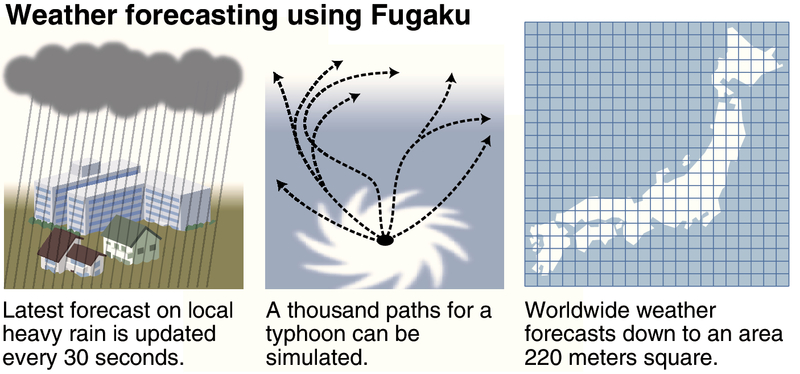 Fugaku performs over 442 quadrillion computations per second, making it about 12,000 times faster than the Earth Simulator's 35.8 trillion calculations in 2002. Researchers using Fugaku aim to divide the entire world into sections just 220 meters square and generate specific weather predictions for each of them, using data from satellites equipped with high-performance radar.