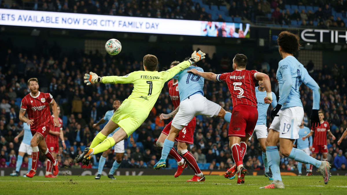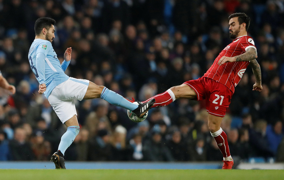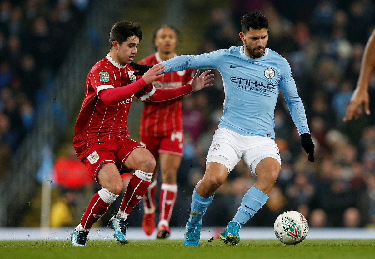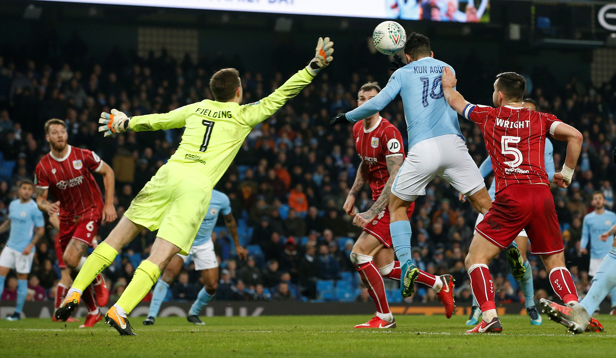 MANCHESTER, England (Reuters) - Manchester City forward Sergio Aguero's last-gasp header secured a 2-1 victory over Bristol City in their League Cup semi-final first leg on Tuesday after the second-tier side had frustrated the Premier League leaders.