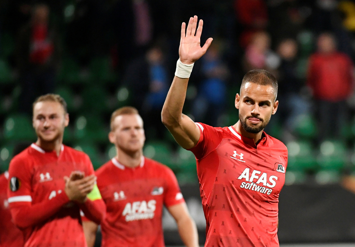 Soccer Football - Europa League - Group L - AZ Alkmaar v Manchester United - Cars Jeans Stadion, Hague, Netherlands - October 3, 2019 AZ Alkmaar's Pantelis Hatzidiakos waves to the fans after the match REUTERS/Piroschka van de Wouw