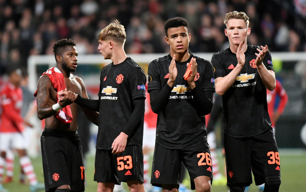 Soccer Football - Europa League - Group L - AZ Alkmaar v Manchester United - Cars Jeans Stadion, Hague, Netherlands - October 3, 2019 Manchester United's Mason Greenwood and Manchester United's Scott McTominay applaud the fans after the match as Brandon Williams and Fred shake hands REUTERS/Piroschka van de Wouw