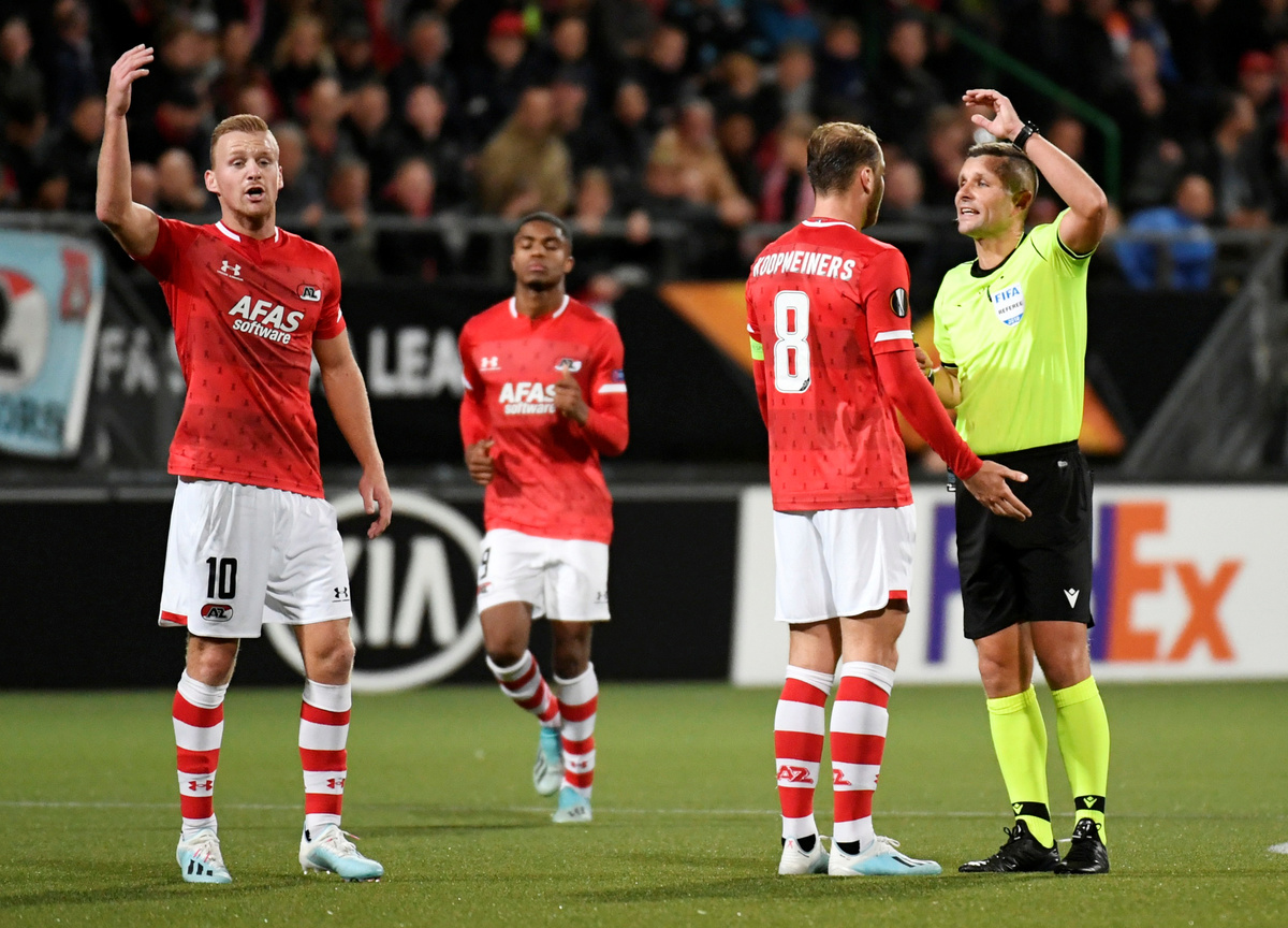 Soccer Football - Europa League - Group L - AZ Alkmaar v Manchester United - Cars Jeans Stadion, Hague, Netherlands - October 3, 2019 Manchester United manager Ole Gunnar Solskjaer waves to the fans after the match REUTERS/Piroschka van de WouwSoccer Football - Europa League - Group L - AZ Alkmaar v Manchester United - Cars Jeans Stadion, Hague, Netherlands - October 3, 2019 AZ Alkmaar's Yukinari Sugawara celebrates after the match REUTERS/Piroschka van de WouwSoccer Football - Europa League - Group L - AZ Alkmaar v Manchester United - Cars Jeans Stadion, Hague, Netherlands - October 3, 2019 Referee Gediminas Mazeika talks to Manchester United's Marcus Rashford REUTERS/Piroschka van de WouwSoccer Football - Europa League - Group L - AZ Alkmaar v Manchester United - Cars Jeans Stadion, Hague, Netherlands - October 3, 2019 Manchester United's Marcus Rashford in action REUTERS/Piroschka van de WouwSoccer Football - Europa League - Group L - AZ Alkmaar v Manchester United - Cars Jeans Stadion, Hague, Netherlands - October 3, 2019 Referee Gediminas Mazeika talks to AZ Alkmaar's Teun Koopmeiners as Dani de Wit reacts REUTERS/Piroschka van de WouwSoccer Football - Europa League - Group L - AZ Alkmaar v Manchester United - Cars Jeans Stadion, Hague, Netherlands - October 3, 2019 Manchester United's Nemanja Matic in action with AZ Alkmaar's Fredrik Midtsjo REUTERS/Piroschka van de WouwSoccer Football - Europa League - Group L - AZ Alkmaar v Manchester United - Cars Jeans Stadion, Hague, Netherlands - October 3, 2019 AZ Alkmaar's Fredrik Midtsjo in action with Manchester United's Angel Gomes REUTERS/Piroschka van de Wouw
