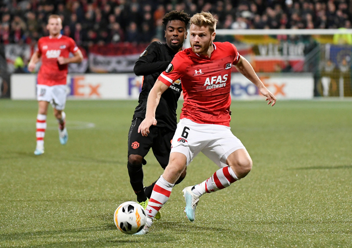 Soccer Football - Europa League - Group L - AZ Alkmaar v Manchester United - Cars Jeans Stadion, Hague, Netherlands - October 3, 2019 AZ Alkmaar's Calvin Stengs in action with Manchester United's Angel Gomes REUTERS/Piroschka van de Wouw