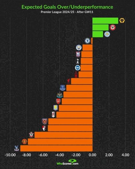 With 16 goals scored from just 11.80 xG, Wolves are the biggest overperformers in the league. They may not create many chances, but they take the few opportunities they get.