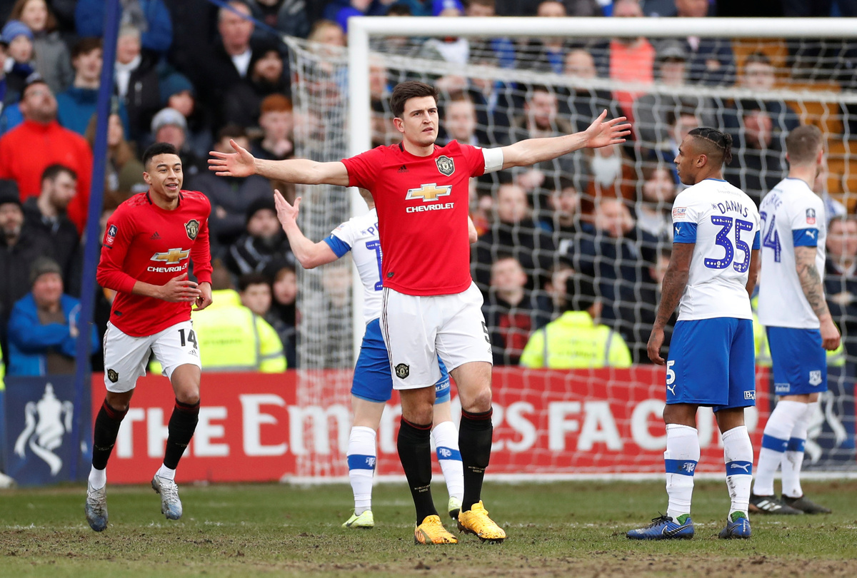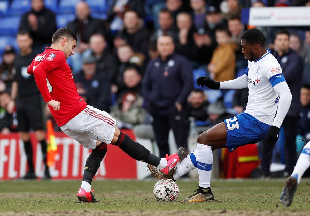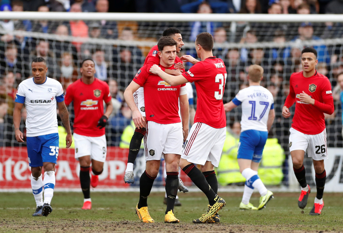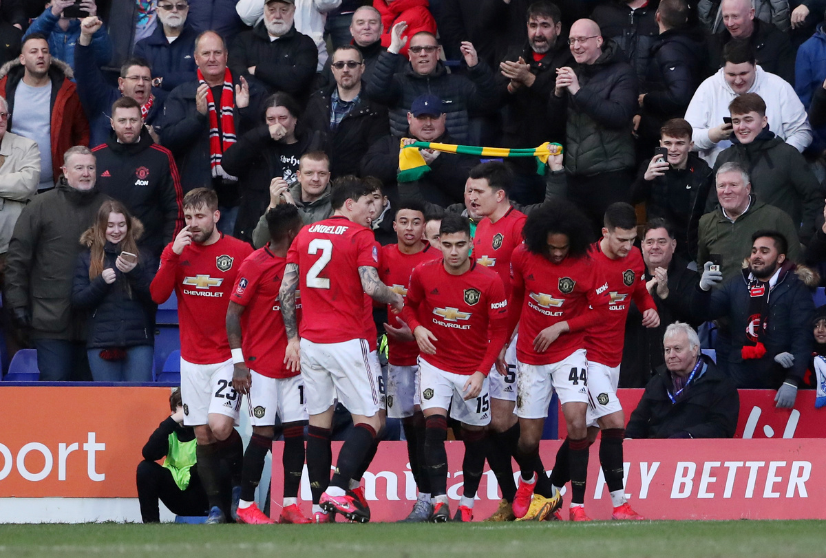 Soccer Football - FA Cup Fourth Round - Tranmere Rovers v Manchester United - Prenton Park, Birkenhead, Britain - January 26, 2020 Tranmere Rovers' Emmanuel Monthe in action with Manchester United's Mason Greenwood REUTERS/Scott HeppellSoccer Football - FA Cup Fourth Round - Tranmere Rovers v Manchester United - Prenton Park, Birkenhead, Britain - January 26, 2020 Manchester United's Andreas Pereira in action with Tranmere Rovers' Corey Blackett-Taylor Action Images via Reuters/Andrew BoyersSoccer Football - FA Cup Fourth Round - Tranmere Rovers v Manchester United - Prenton Park, Birkenhead, Britain - January 26, 2020 Manchester United's Harry Maguire celebrates scoring their first goal Action Images via Reuters/Andrew BoyersSoccer Football - FA Cup Fourth Round - Tranmere Rovers v Manchester United - Prenton Park, Birkenhead, Britain - January 26, 2020 Manchester United's Harry Maguire celebrates scoring their first goal with teammates Action Images via Reuters/Andrew BoyersSoccer Football - FA Cup Fourth Round - Tranmere Rovers v Manchester United - Prenton Park, Birkenhead, Britain - January 26, 2020 Manchester United's Jesse Lingard scores their third goal Action Images via Reuters/Andrew BoyersSoccer Football - FA Cup Fourth Round - Tranmere Rovers v Manchester United - Prenton Park, Birkenhead, Britain - January 26, 2020 Tranmere Rovers' Morgan Ferrier in action with Manchester United's Andreas Pereira Action Images via Reuters/Andrew BoyersSoccer Football - FA Cup Fourth Round - Tranmere Rovers v Manchester United - Prenton Park, Birkenhead, Britain - January 26, 2020 General view inside the stadium during the match Action Images via Reuters/Andrew BoyersSoccer Football - FA Cup Fourth Round - Tranmere Rovers v Manchester United - Prenton Park, Birkenhead, Britain - January 26, 2020 Manchester United's Sergio Romero celebrates with Diogo Dalot after the match REUTERS/Scott Heppell