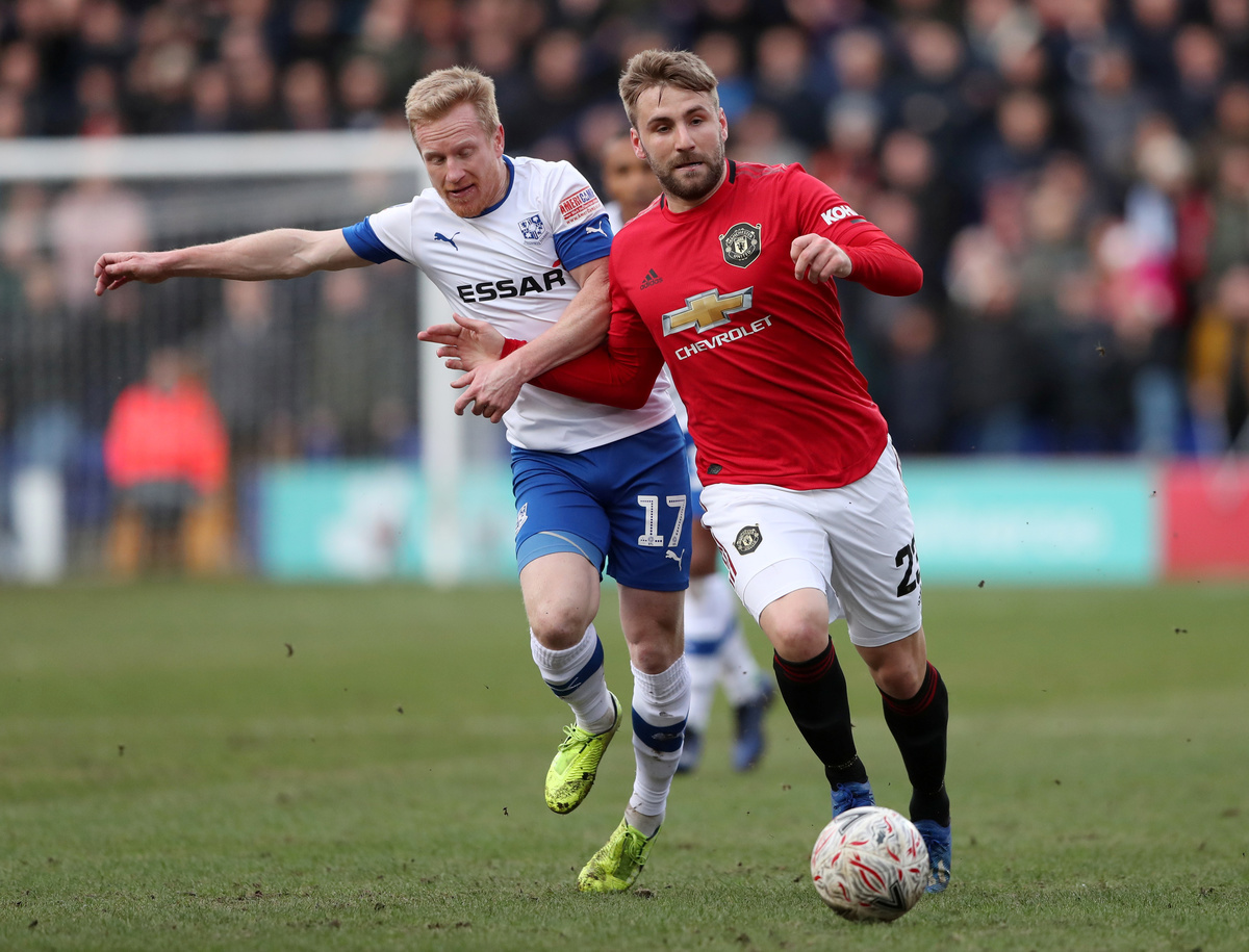 Soccer Football - FA Cup Fourth Round - Tranmere Rovers v Manchester United - Prenton Park, Birkenhead, Britain - January 26, 2020 Manchester United's Luke Shaw in action with Tranmere Rovers' David Perkins REUTERS/Scott Heppell