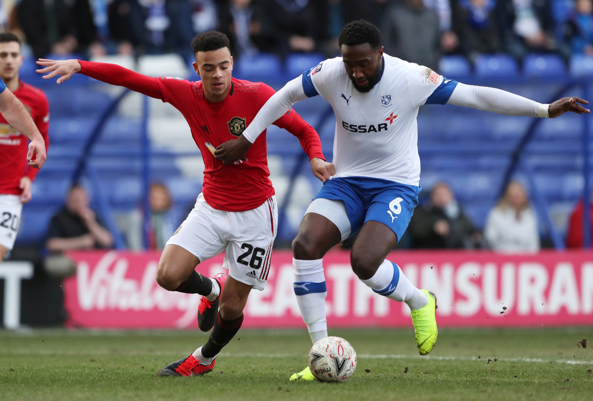 Soccer Football - FA Cup Fourth Round - Tranmere Rovers v Manchester United - Prenton Park, Birkenhead, Britain - January 26, 2020 Tranmere Rovers' Neil Danns in action with Manchester United's Mason Greenwood REUTERS/Scott Heppell